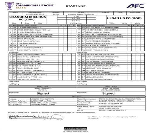 10月1日晚,在2025/26赛季亚冠精英联赛第2轮中,中超豪门上海申花坐镇主场上海体育场,迎战韩国K联赛劲旅蔚山HD。赛前,两队首发名单公布。