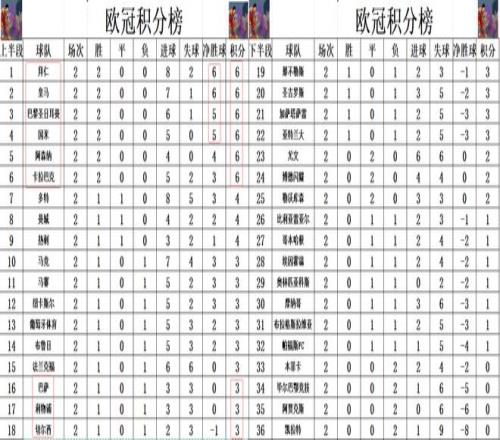 积分榜方面,2轮战罢只剩下6支球队保持全胜,分别是拜仁,皇马,巴黎,国米,阿森纳和卡拉巴克。拜仁1个进球优势力压皇马领跑,巴黎则是1个进球优势超过国米升至第3,阿森纳差国米1个净胜球排在第5。巴萨被绝杀后排名下滑,刚好排在利物浦和切尔西之前位列第16。