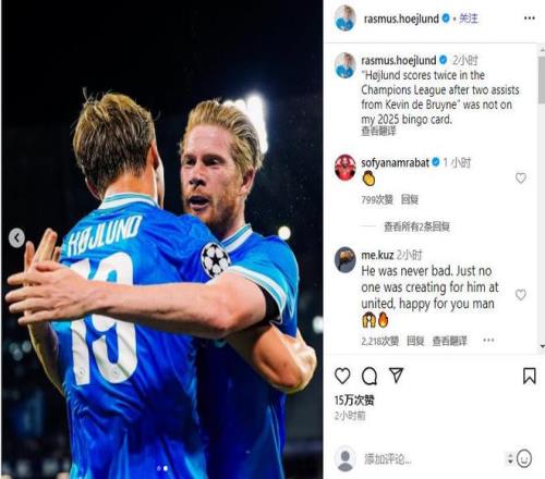 赛后霍伊伦在社交网站上写道:“霍伊伦在欧冠梅开二度,而助攻者竟是德布劳内——这剧情,我在2025年的 bingo卡(预测卡)上可完全没写啊!”
