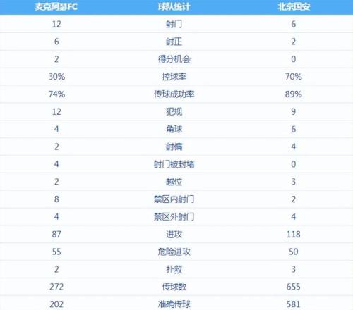 本场比赛北京国安踢出两个极端,好的一方面是场面数据非常漂亮——控球率高达70%,对手仅30%,传球成功率也比对手高出不少,传球次数655是对手的2倍有余。然而漂亮的数据背后却是尴尬的比分:0比3,对手打进3球,国安连像样的威胁射门都没有。