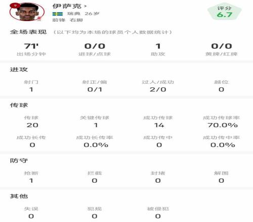 伊萨克本场比赛20次传球,其中14次成功,成功率70%,包括1次关键传球。
