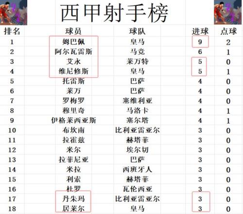射手榜方面,姆巴佩传射,维尼修斯双响,今天两人均造2球,姆巴佩8轮打入9球继续稳居榜首,维尼修斯则是和今天打入一球的艾永5球并列第3。阿尔瓦雷斯差姆巴佩3球排在第2,居莱尔,拉菲尼亚,丹朱玛等人3球刚好挤入前十。