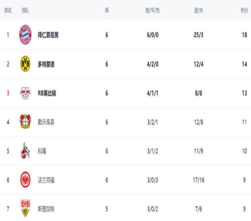 在积分榜上,拜仁6战全胜,以18分高居榜首,独一档的存在。而这轮丢掉2分的多特蒙德则以14分排名第2。莱比锡13分,排名第3。勒沃库森3胜2平1负,拿到11分,排名第4。科隆以10分排名第5。法兰克福和斯图加特都是9分,排名第6和第7。
