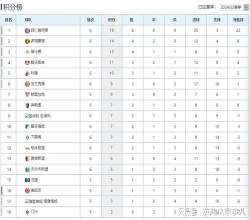 德甲最新积分榜:拜仁豪取6连胜4分领跑,多特战平莱比锡位列第2