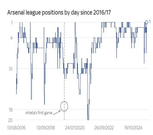 在阿尔特塔执教的第一个完整赛季,阿森纳排名第8位,而在他执教的第50场比赛里,阿森纳在酋长球场0比3负于利物浦,排名第9位,只比阿莫林执教50场之后在英超的排名高一位。