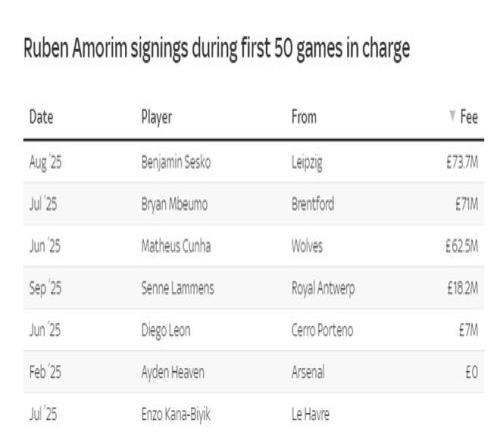 在阿莫林执教之后,曼联签入的球员较少,但转会费更高,塞斯科、姆贝莫、库尼亚、拉门斯等球员的转会费高达2.32亿英镑,明显超过了阿尔特塔执教时的同期费用。