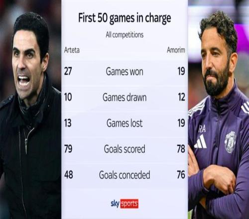 在阿莫林饱受质疑的情况下,拉特克利夫表示会给阿莫林三年时间,并且引用了阿尔特塔执教阿森纳时开局,作为对阿莫林保持耐心的理由。那么,阿尔特塔、阿莫林在执教阿森纳、曼联的前50场比赛有什么不同呢?
