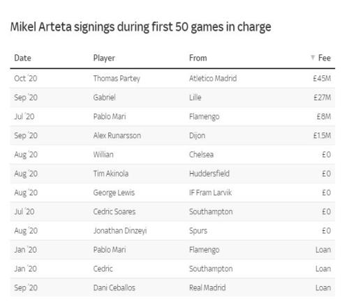 阿森纳的转会支出近些年以来有所增加,夏窗达到了创纪录的2.57亿英镑。然而,在阿尔特塔执教的前50场比赛里,俱乐部的支出更为谨慎,主要依靠租借和自由转会,两个转会窗口仅仅投入了8150万英镑。托马斯和加布里埃尔是仅有的两位以高额转会费加盟的球员。