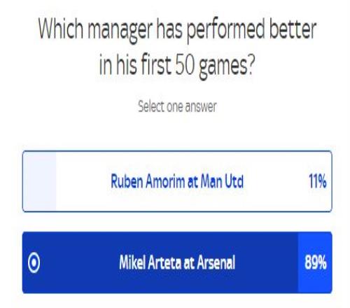 《天空体育》的调查显示,89%的球迷认为阿尔特塔执教阿森纳前50场时更加成功,只有11%的球迷认为阿莫林更成功。