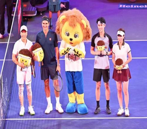 费德勒与甄子丹(左一)、郑洁(右一)、吴磊(右二)上演双打秀。