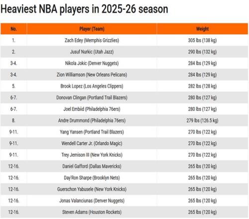 NBA现役最重球员排名:杨瀚森122公斤第9扎克伊迪居首约基奇第3