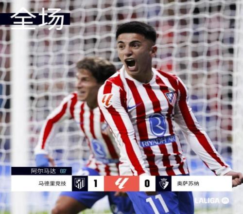西甲第9轮,马竞主场1比0小胜奥萨苏纳,排名升至第4位。第9分钟,阿尔瓦雷斯销魂直塞助攻巴埃纳首开纪录,但主裁判观看回放后判定格列兹曼阻挡后卫犯规(图②),进球无效。第63分钟阿尔马达复出换下巴埃纳;第69分钟,朱利亚诺·西蒙尼右路突破下底传中,阿尔马达门前包抄打入全场唯一进球(图③)。
