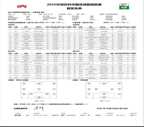 北京时间10月19日19:35,中超联赛第27轮,河南主场迎战长春亚泰,赛前双方公布首发阵容: