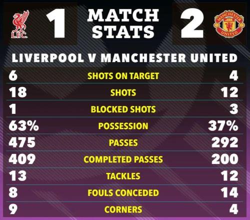 这是曼联今年3月以来首次在英超客场赢球,亦是2016年1月之后首次在客场战胜利物浦,终结了在安菲尔德球场连续9场联赛不胜(5平4负)的尴尬纪录。