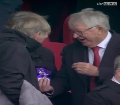 曼联一球领先结束上半场,弗爵在看台上也颇为轻松,与利物浦名宿达格利什分享了自己的巧克力。