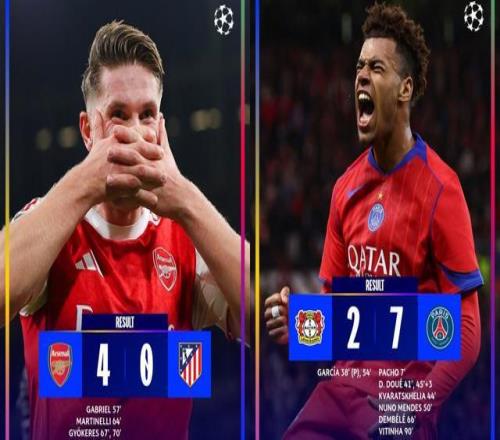 其中颇受瞩目的两场较量,阿森纳坐镇主场4-0碾压马竞,巴黎客场7-2狂胜勒沃库森!