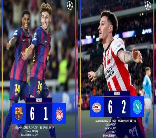 除了这两场大比分惨案,西甲豪门巴萨和荷甲劲旅PSV埃因霍温上演单场狂轰6球,分别6-1击败希腊球队奥林匹亚科斯、6-2爆冷大胜上赛季意甲冠军那不勒斯!