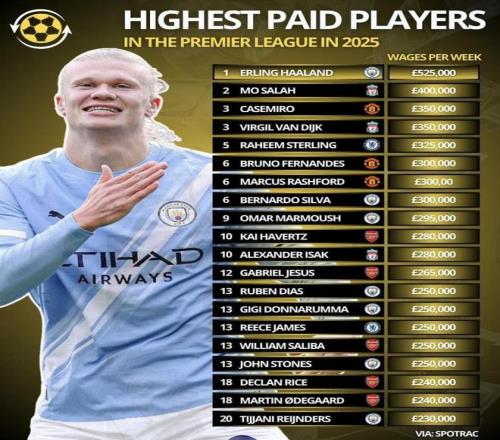 英超工资最高的前20人!曼城六名阿森纳五名!哈兰德每周479万元