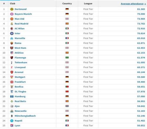 多特蒙德西格纳伊杜纳公园球场以场均81365名观众领跑,拜仁慕尼黑主场安联球场以场均75000名观众位居第二,曼联老特拉福德以场均73969名观众位列第三,皇家马德里主场伯纳乌以场均73782名观众排名第四,大连英博梭鱼湾球场以场均57978名观众位列第18。