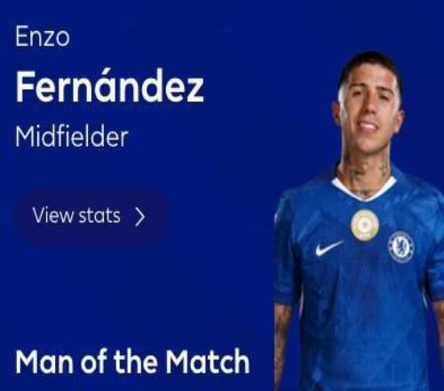 最终经过英超官网球迷投票,恩佐以39%的得票率力压佩德罗-内托(37%)当选全场最佳球员。