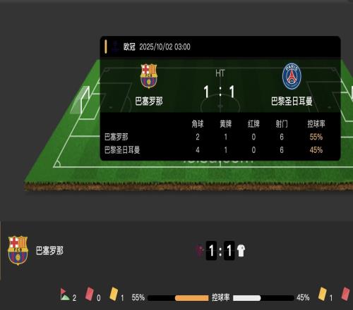 巴萨vs巴黎半场数据:双方均6次射门2次射正,控球率巴萨领先