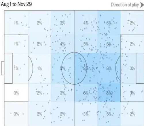 整场比赛,维尔茨触球52次,其触球热点图近乎“放射性”,显示他愿意且能够在球场任何区域接球。