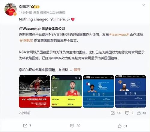 李凯尔经纪公司Wasserman在第一时间进行了声明,这家公司表示李凯尔恢复美国国籍的信息并不属实,他现在依然是中国国籍,有资格代表中国男篮征战世界赛场。李凯尔经纪公司还指出李凯尔不是FIBA规则下的归化雇佣兵,他在中国有根、有家人。如果国家队需要,不排除未来继续效力的可能性。甚至未来有可能来CBA打球。李凯尔本人也转发了相关的声明,他表示:“没有任何的改变。我还在这儿。”经纪公司和本人的声明为这次李凯尔的更改国籍的风波划上了句号,原来大家都误会他了。