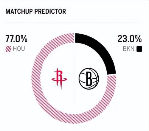 赛前,美媒ESPN对本场比赛进行了预测,火箭胜率高达77.0%,篮网队胜率仅有23.0% ,差距非常明显。