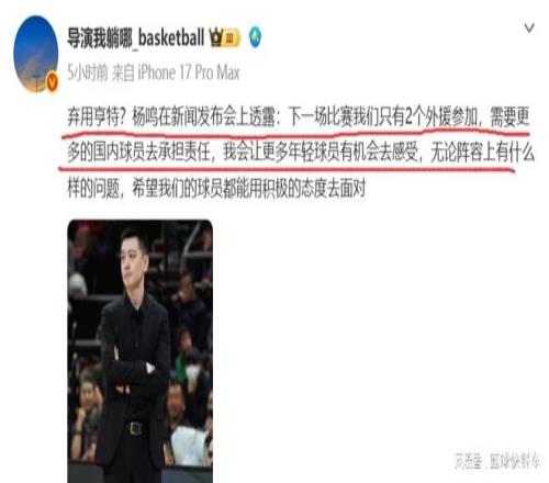 要知道,山西队也是本赛季的实力派球队之一,他们的外援战斗力非常强。即便是辽宁队全外援出战,他们也未必能够占据上风。一旦辽宁队只派出双外援出战,那么,他们在外援方面肯定会吃亏的。不过,从杨鸣的言语中不难看出,他对于亨特的表现已经非常不满意。作为球队的第5外援,他的加盟非但没有帮助到球队,反而拖累了全队的后腿,让辽宁队成为了全联盟的笑话。